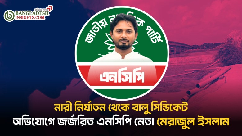 মাদারীপুরের রাজৈর উপজেলার জাতীয় নাগরিক পার্টি (এনসিপি) নেতা মেরাজুল ইসলামের বিরুদ্ধে একের পর এক চাঞ্চল্যকর অভিযোগ উঠেছে। বিয়ের প্রলোভন দেখিয়ে নারী নির্যাতন, অন্তরঙ্গ ভিডিও ধারণ করে ব্ল্যাকমেইল, অর্থ আত্মসাৎ, অবৈধ বালু ব্যবসা ও রাজনৈতিক প্রভাব খাটিয়ে চাঁদাবাজিসহ নানা অনিয়মে জড়িয়ে পড়েছেন এই এনসিপি নেতা।