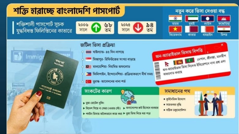 বাংলাদেশি পাসপোর্টধারীদের জন্য আন্তর্জাতিক দরজা দিন দিন বন্ধ হয়ে যাচ্ছে। একসময় যে পাসপোর্টে গর্ব করত প্রবাসী ও বিদেশগামী নাগরিকরা, আজ সেটিই হয়ে দাঁড়িয়েছে ভোগান্তির প্রতীক। সাম্প্রতিক সময়ে ইউরোপ, মধ্যপ্রাচ্য ও দক্ষিণ-পূর্ব এশিয়ার বেশ কয়েকটি দেশ বাংলাদেশি নাগরিকদের ভিসা প্রদান প্রক্রিয়া ‘অস্থায়ীভাবে স...…
